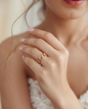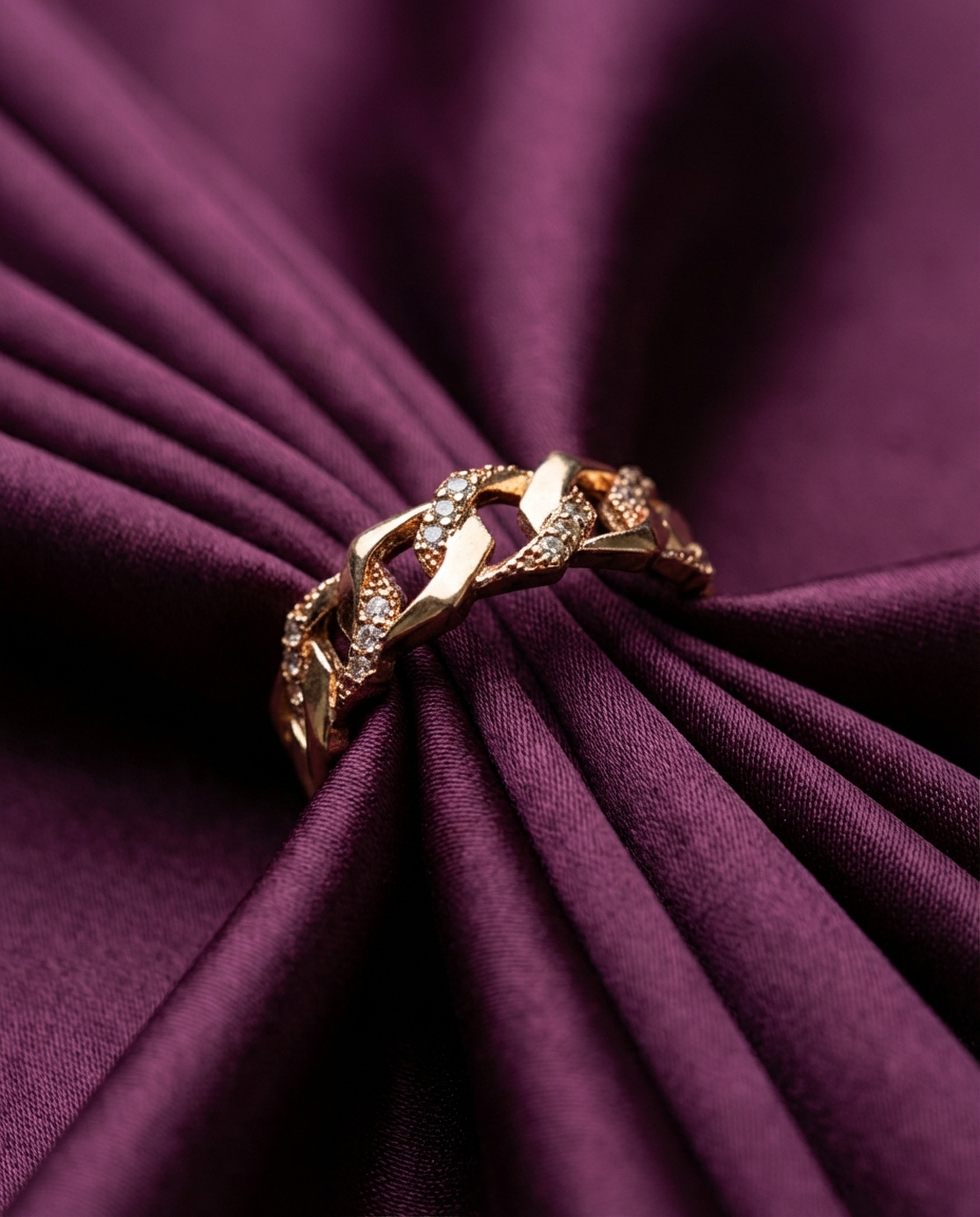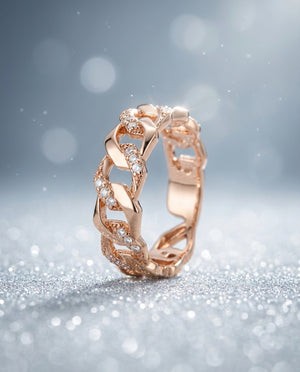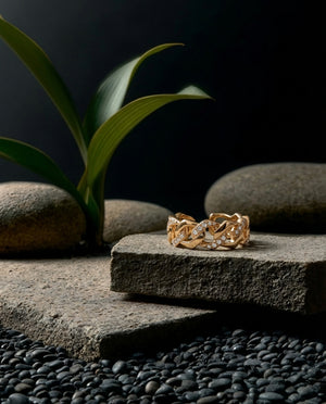 A bold interlocked gold link ring detailed with fine diamonds — designed to make everyday styling feel intentional and elevated.