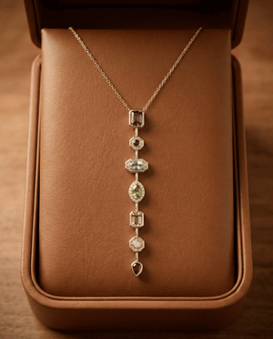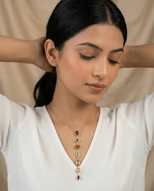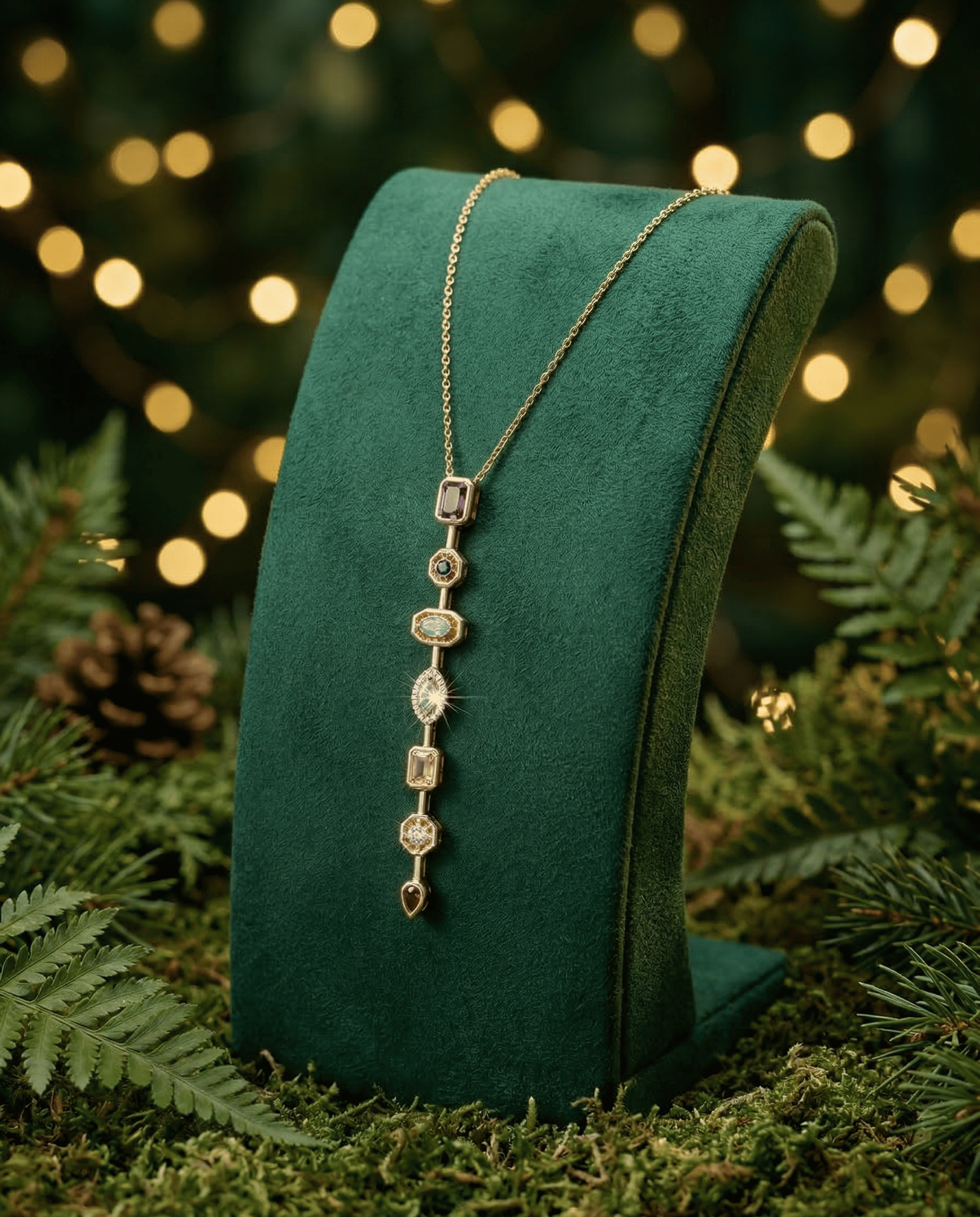 The Prismara is designed as a flowing vertical composition—each stone placed with intention, not symmetry. Different cuts, subtle color shifts, and clean gold framing come together to create something that feels collected over time, yet perfectly balanced.