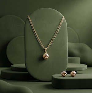 A sculpted knot pendant in three-tone finish, paired with matching studs—designed to move effortlessly from everyday elegance to occasion wear.