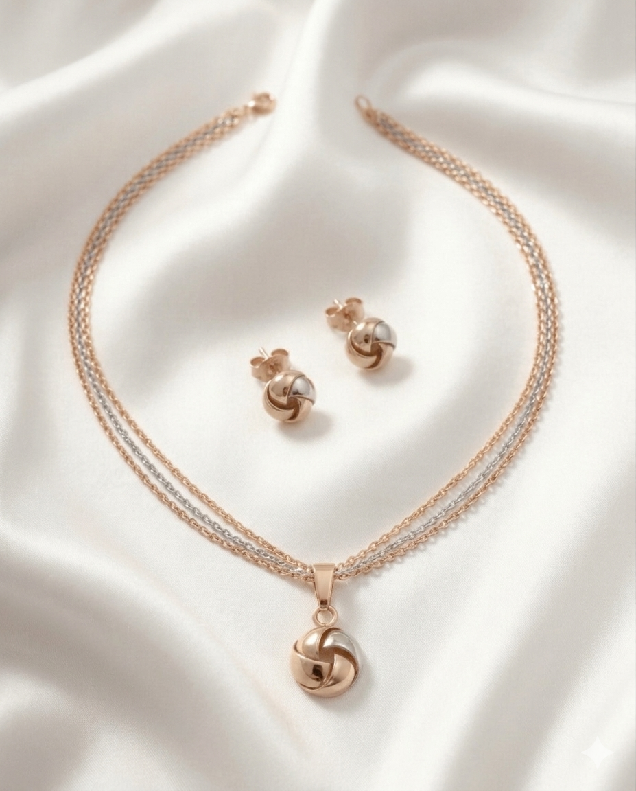 There’s a quiet confidence to this set. The pendant forms a smooth, interlocking knot—three flowing curves in gold, rose gold, and silver tones that catch light from every angle without trying too hard. It feels considered, not flashy.