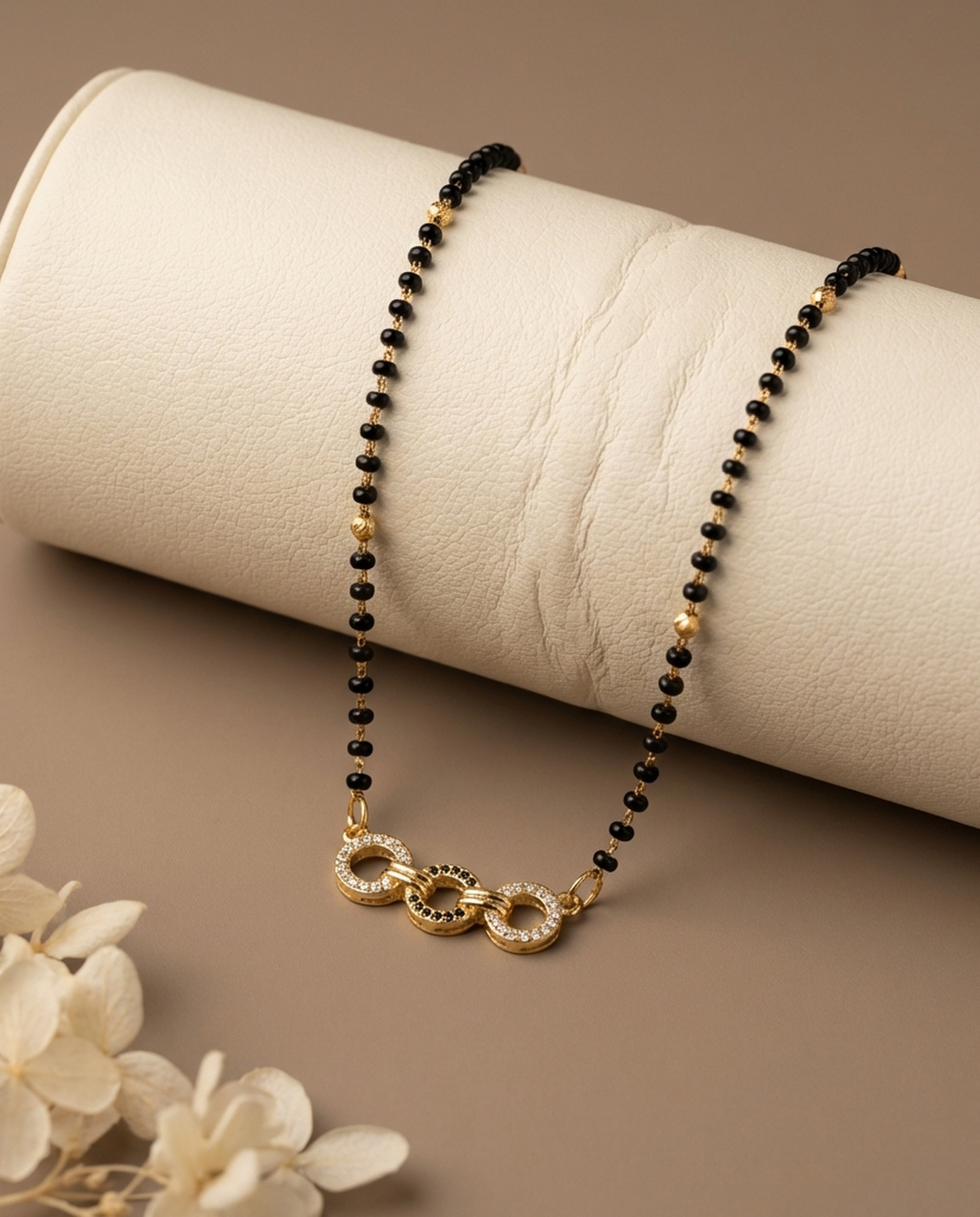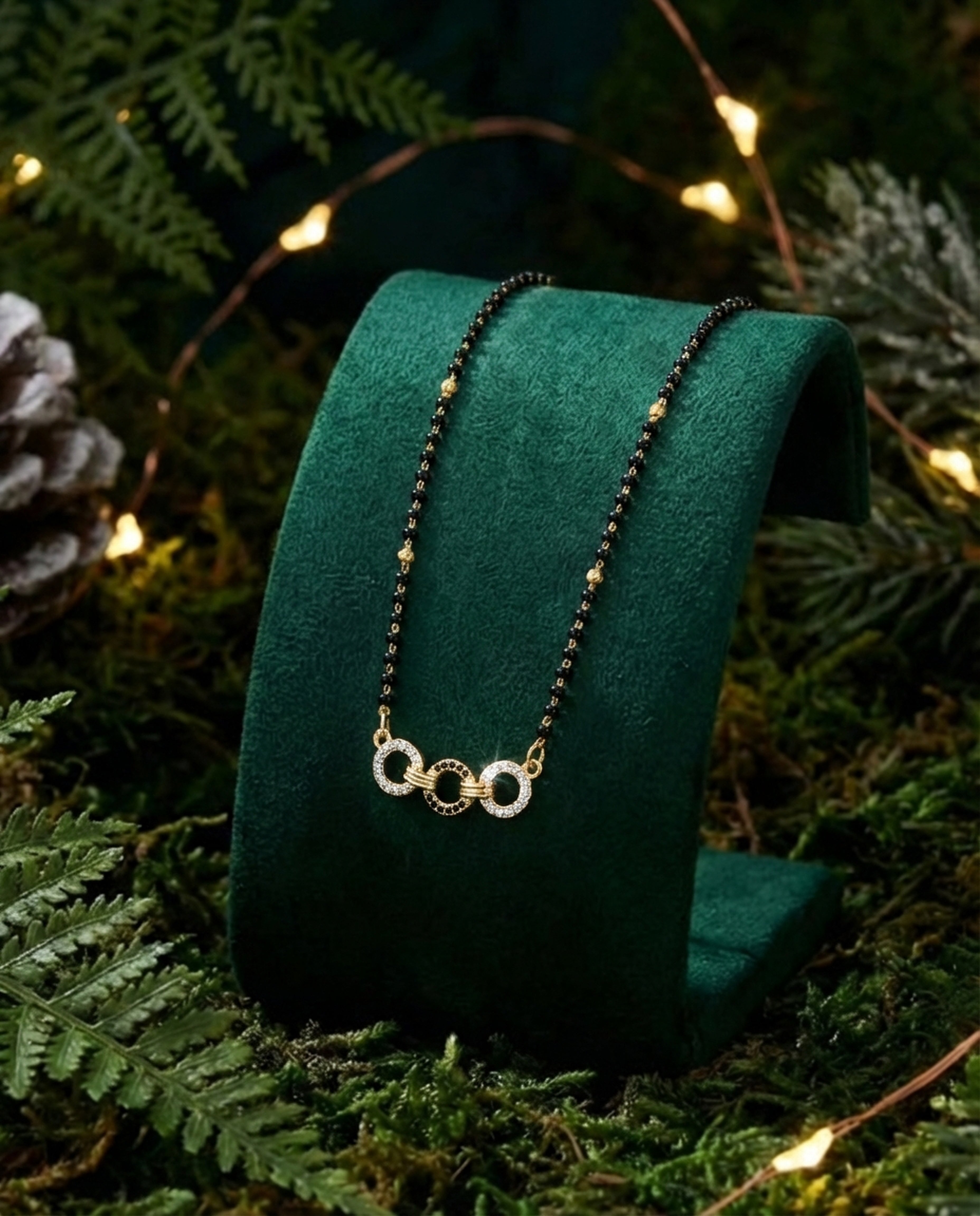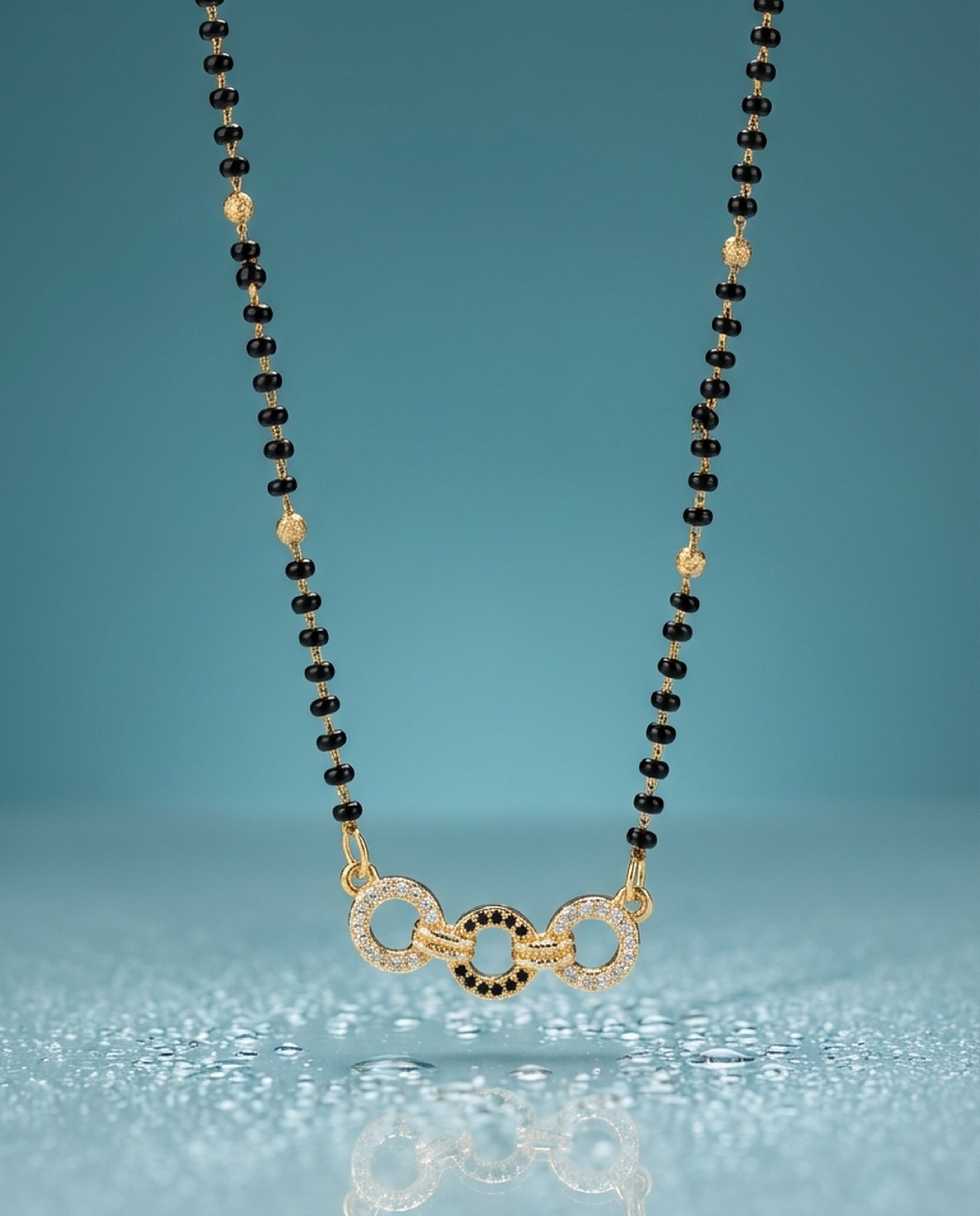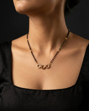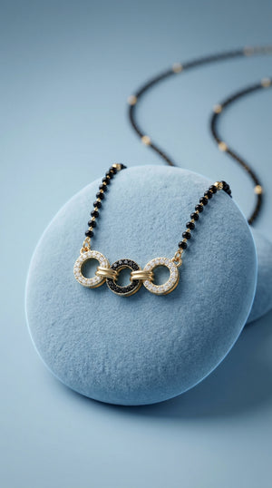 The Arica Trinity Link Mangalsutra brings a modern silhouette to a timeless symbol. Designed with delicate black beads and subtle gold pearl accents, it features three interlocked circular motifs at the center — two encrusted with fine stones and one detailed in contrasting black for depth and character.