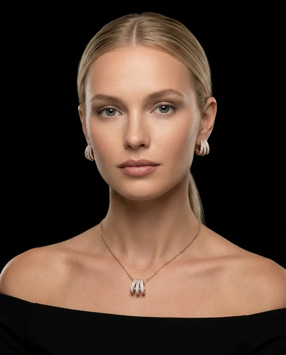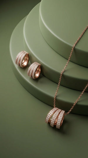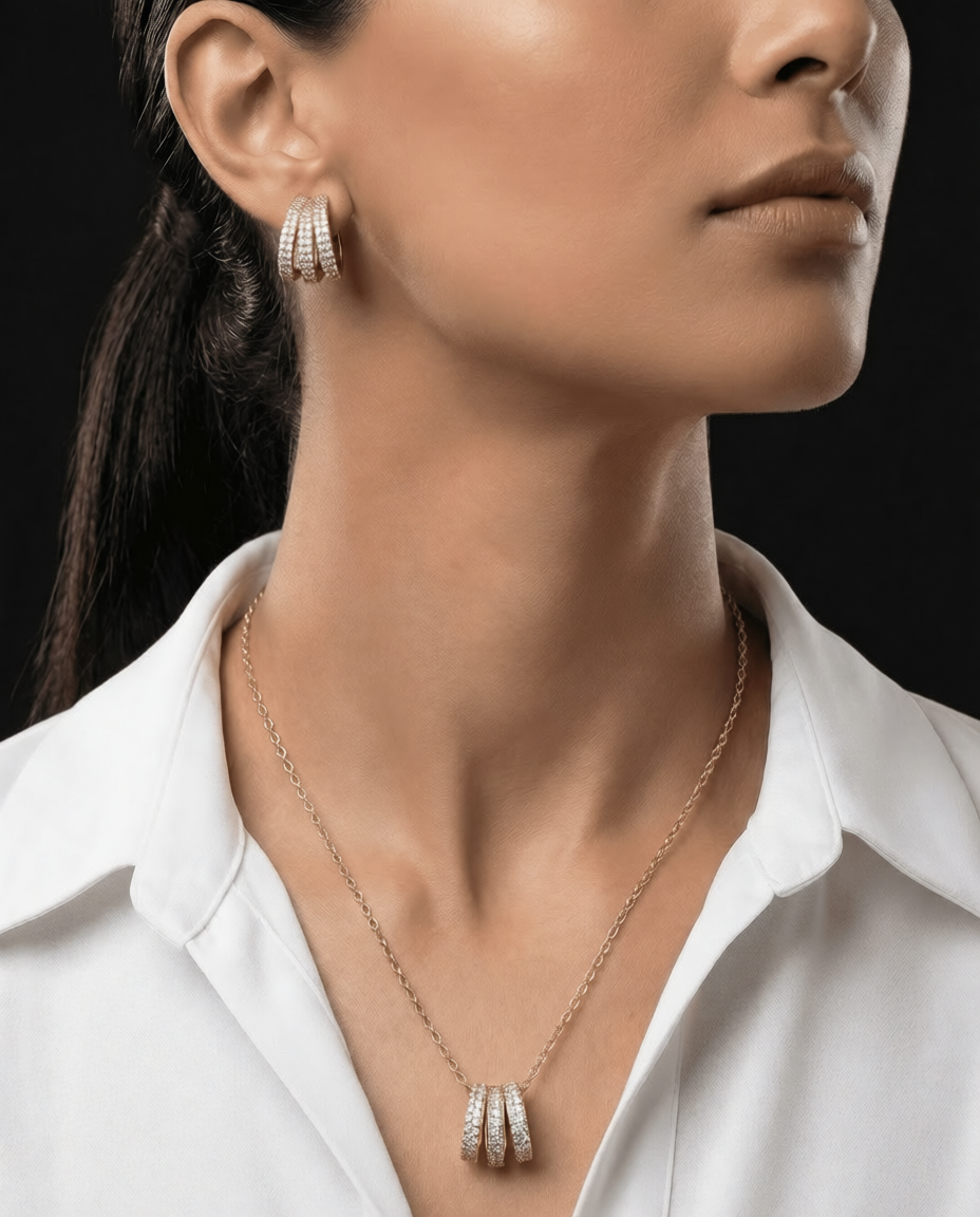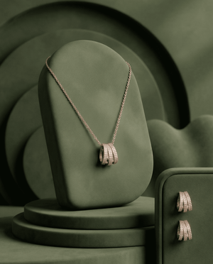 A refined three-band pendant set with fine diamond detailing—designed to bring soft brilliance into everyday styling.