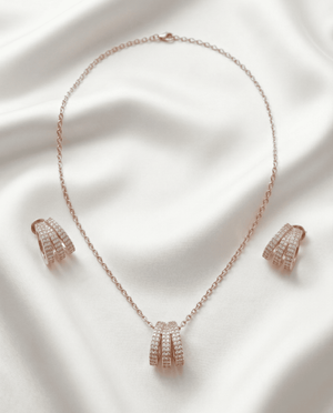 Crafted in a warm rose gold tone, it adds a softer alternative to classic gold—subtle, flattering, and easy to wear across seasons. The matching earrings follow the same curved structure, sitting neatly on the ear and reflecting light with every turn.