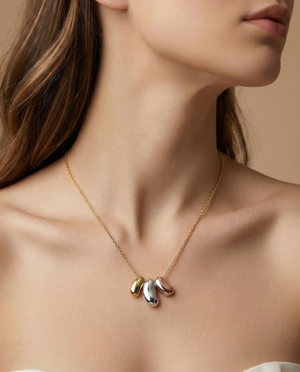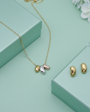 There’s something quietly striking about this piece. Three soft, sculpted drops—each in a different tone—come together in perfect balance, creating a look that feels modern without trying too hard.