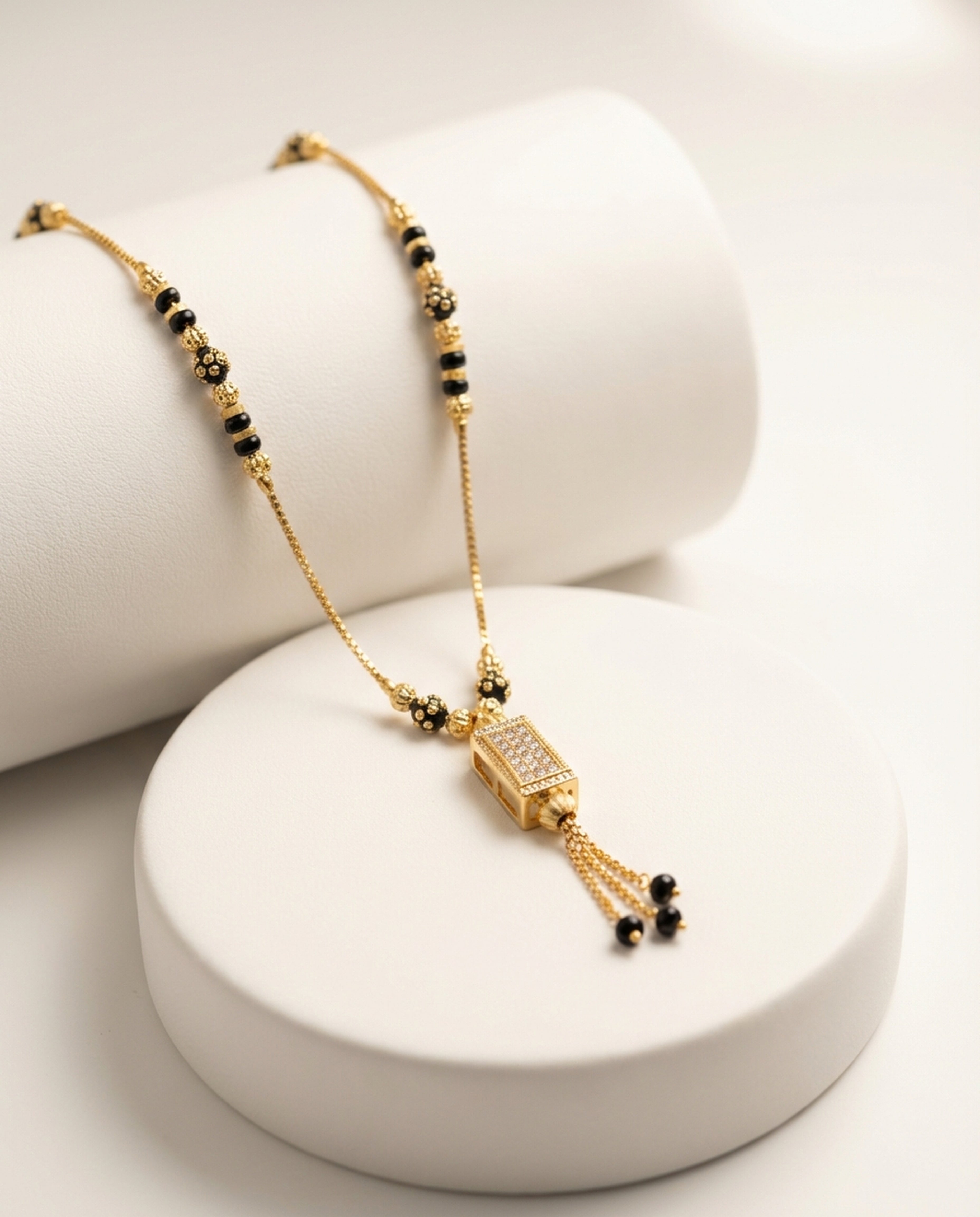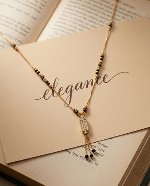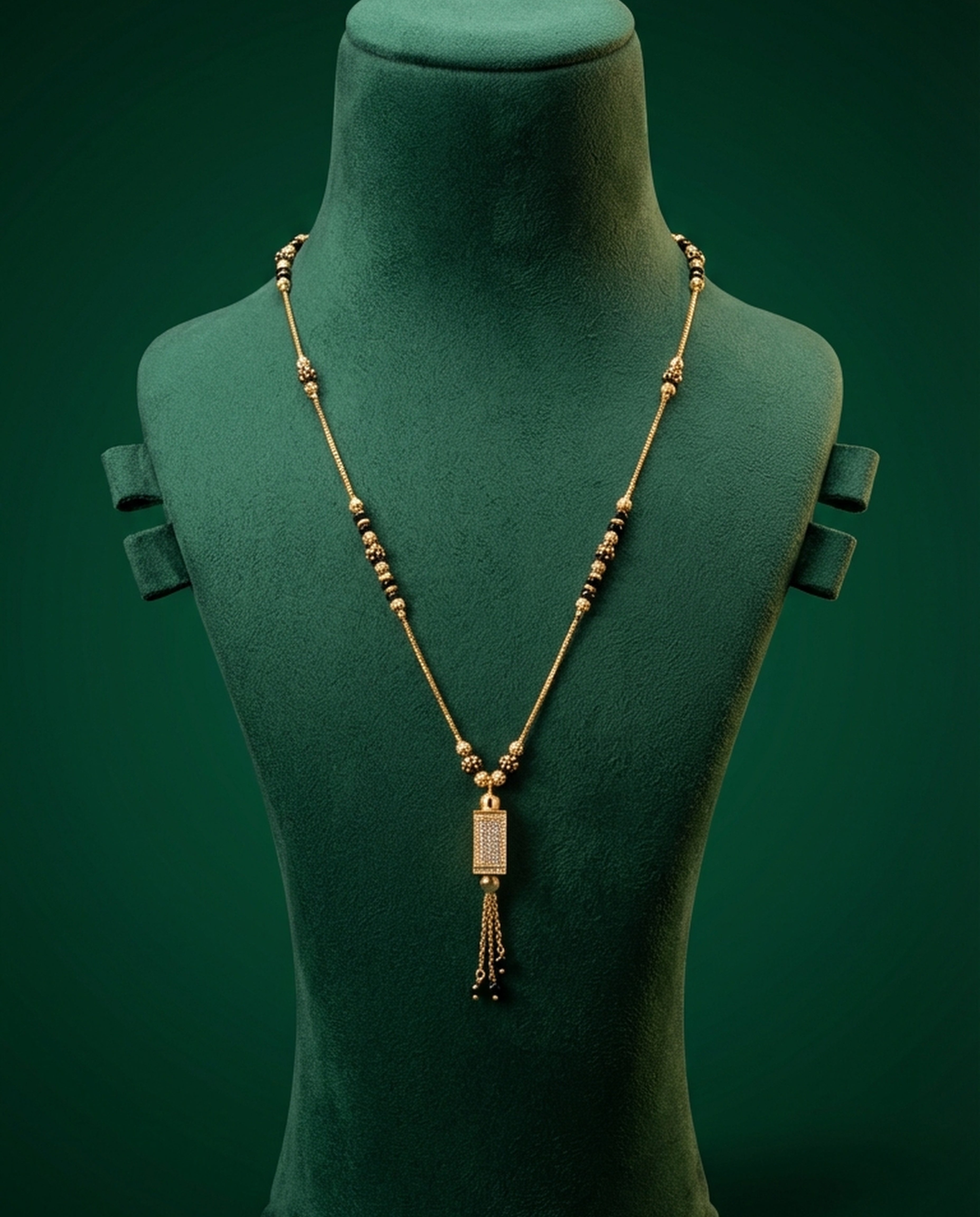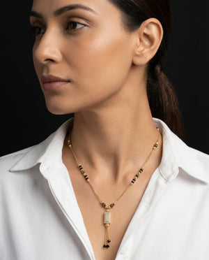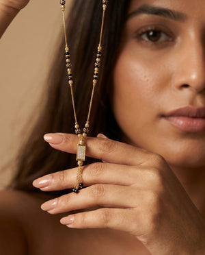 The Vira Tassel Bar Mangalsutra is crafted in a longer silhouette, giving it a more fluid, contemporary fall. Fine black beads are spaced thoughtfully along a slim gold-plated chain, leading to a rectangular textured pendant set with delicate diamond-like detailing. A subtle tassel drop finishes the piece, adding movement without making it dramatic.
